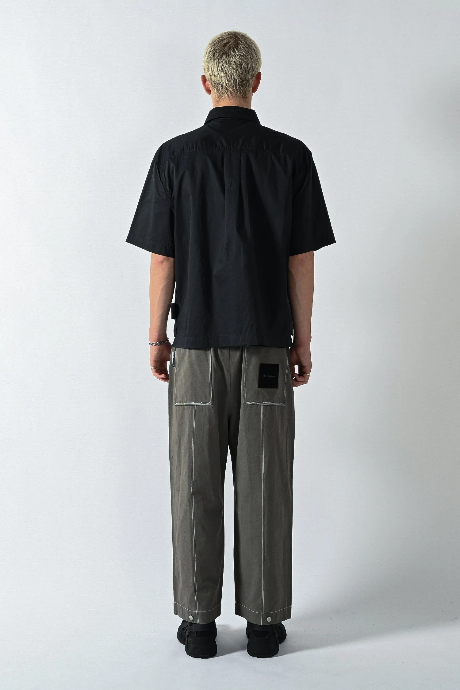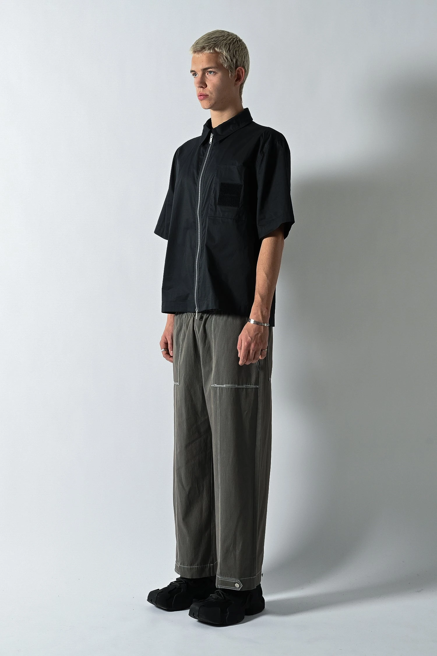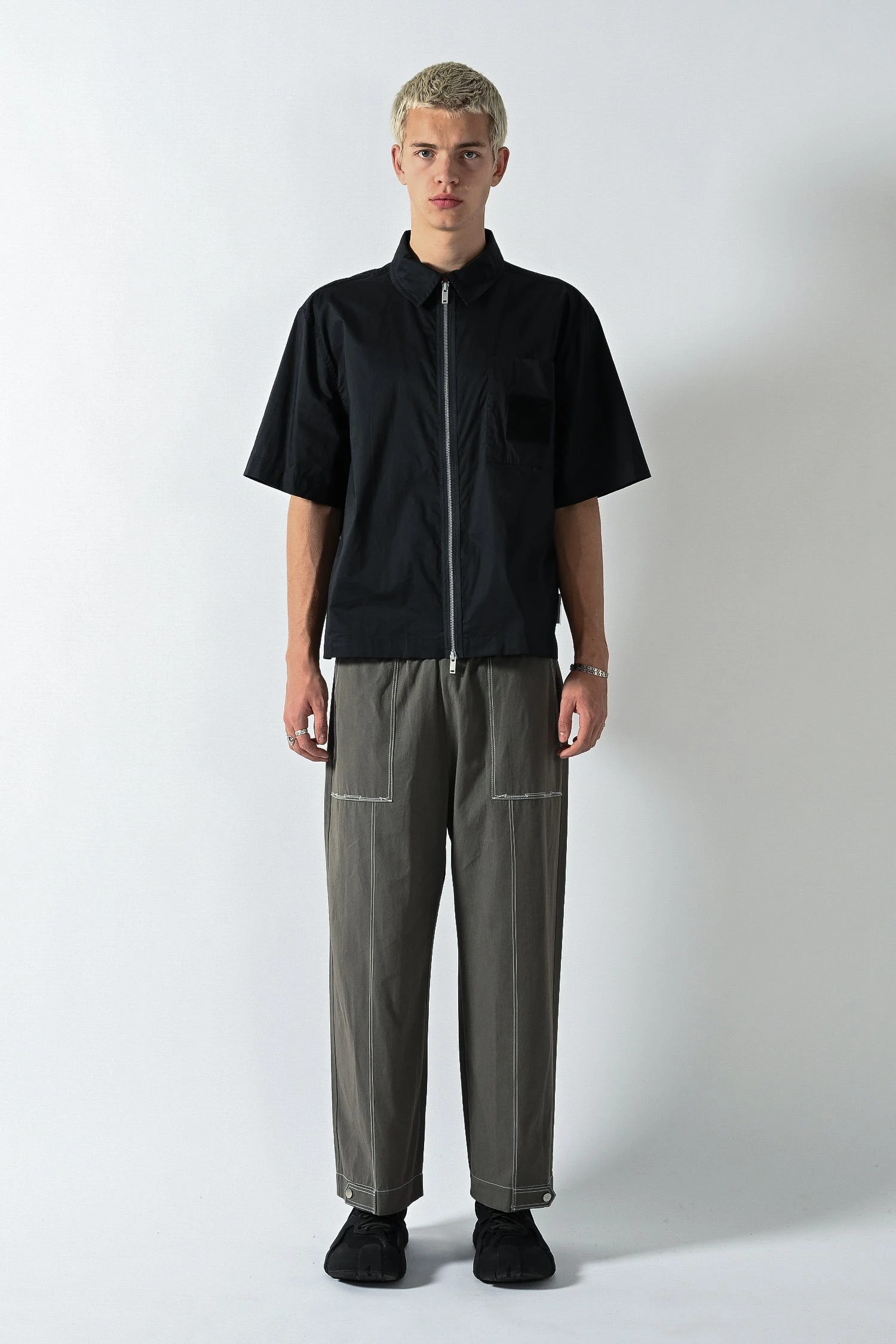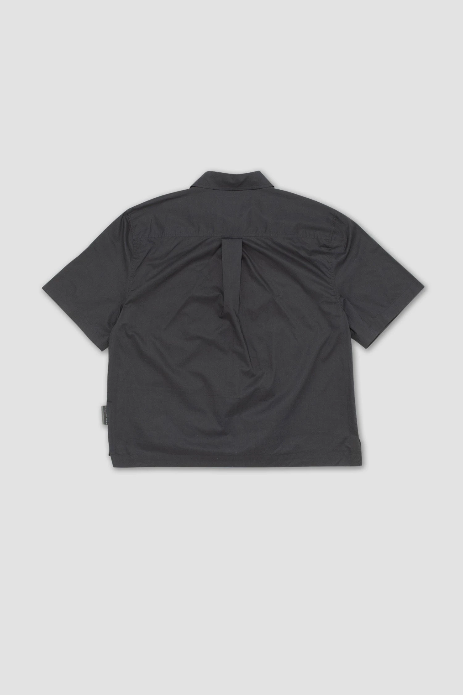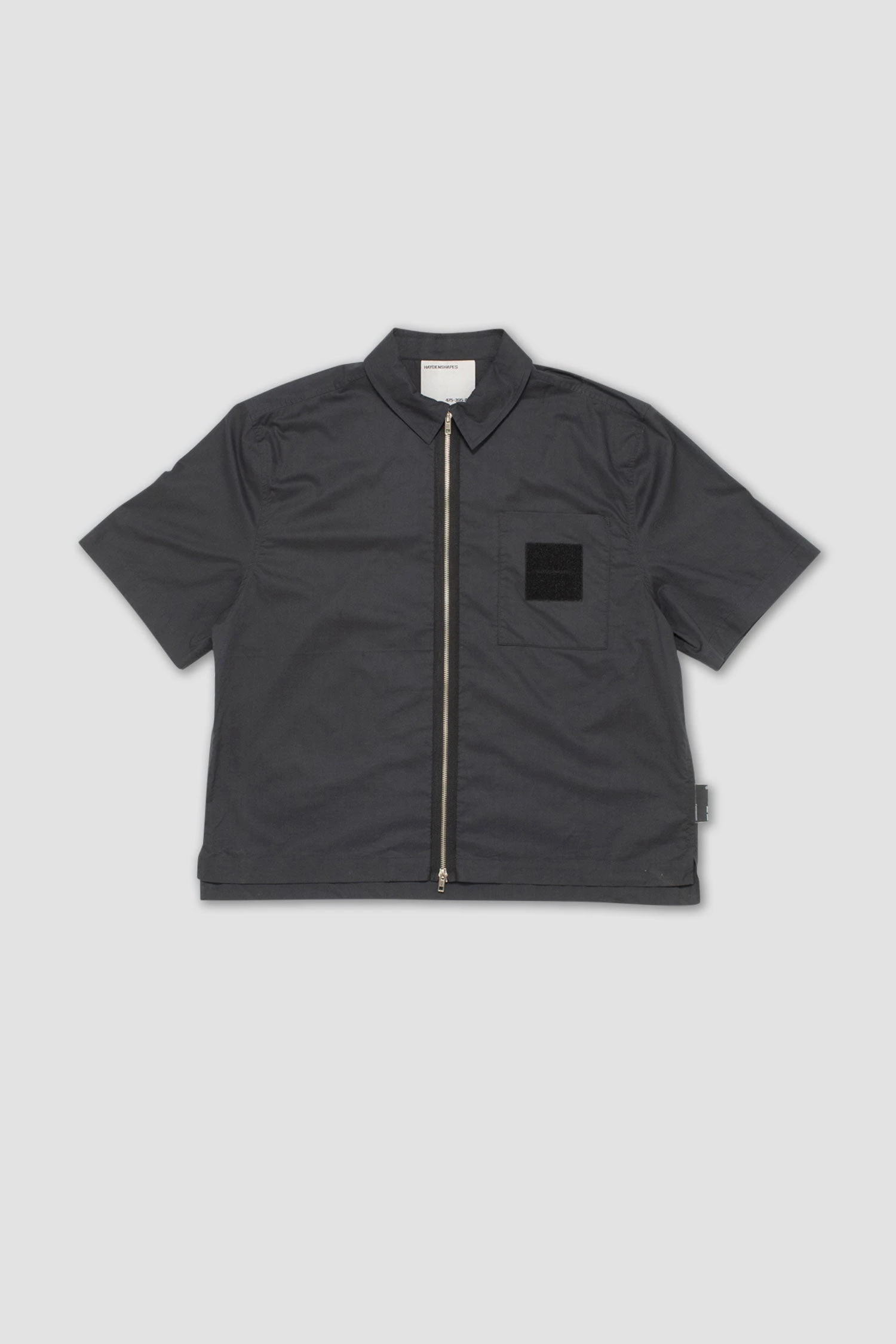 Relaxed boxy fit short sleeve shirt made from high density cotton poplin fabric with a 2 way zip front closure, large chest pocket, dropped shoulders and an extended sleeve length.