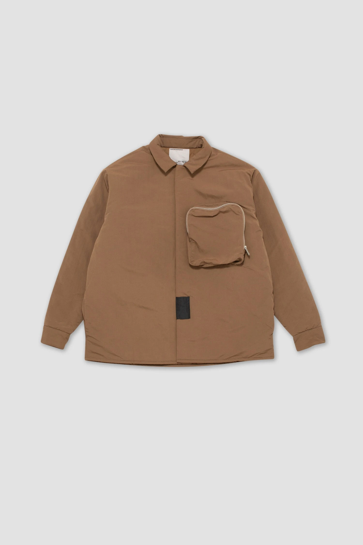 Made of custom woven 105 gsm peached poly nylon fabric with a light recycled down lining, this outwear shirt design features large utility pockets with oversized zip detail.