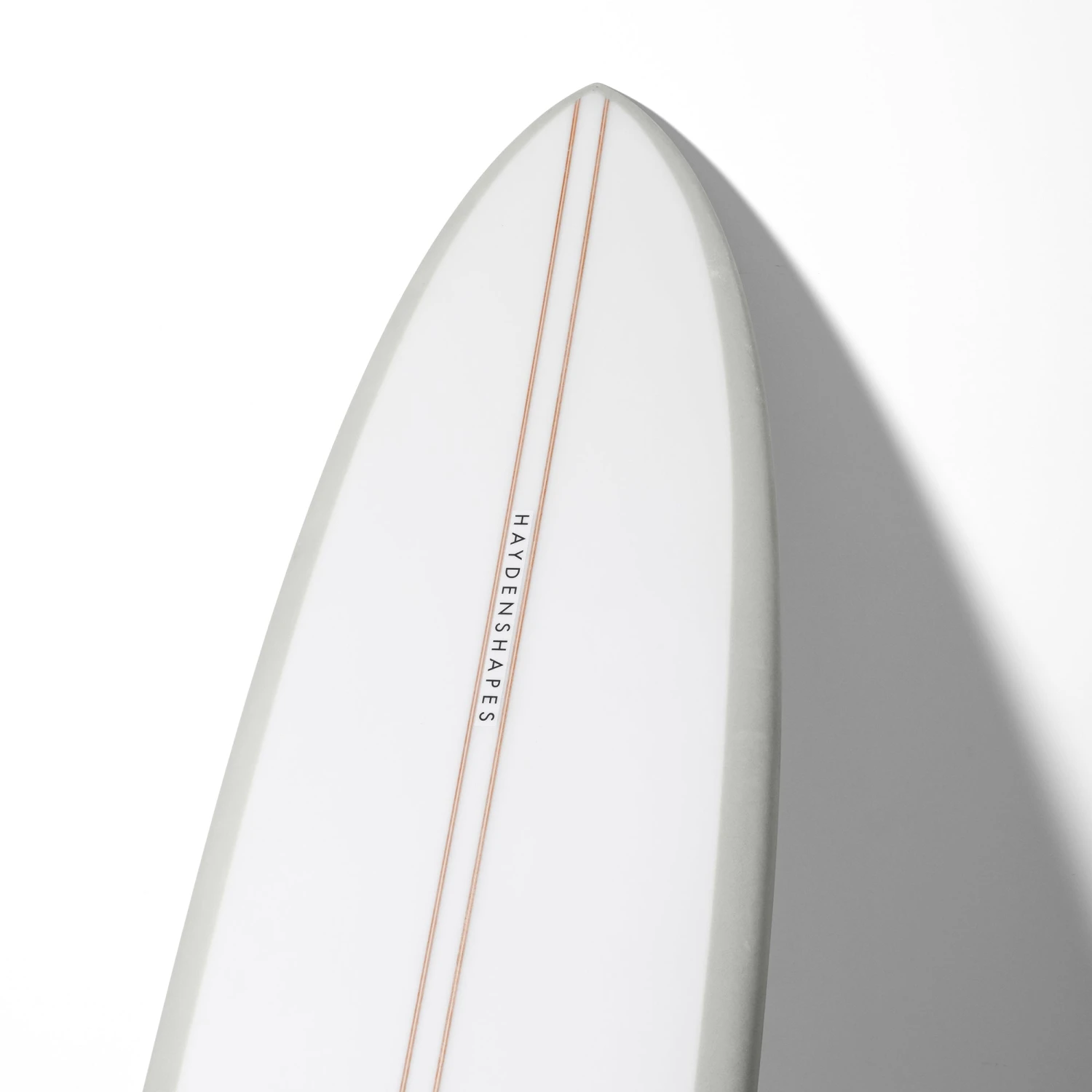 “This style of shape was a request from Craig earlier in 2020, to surf in average waves – as well as on the bigger days whilst being stuck at home. Its flatter rocker makes it a really great paddler; able to catch almost anything” – Hayden