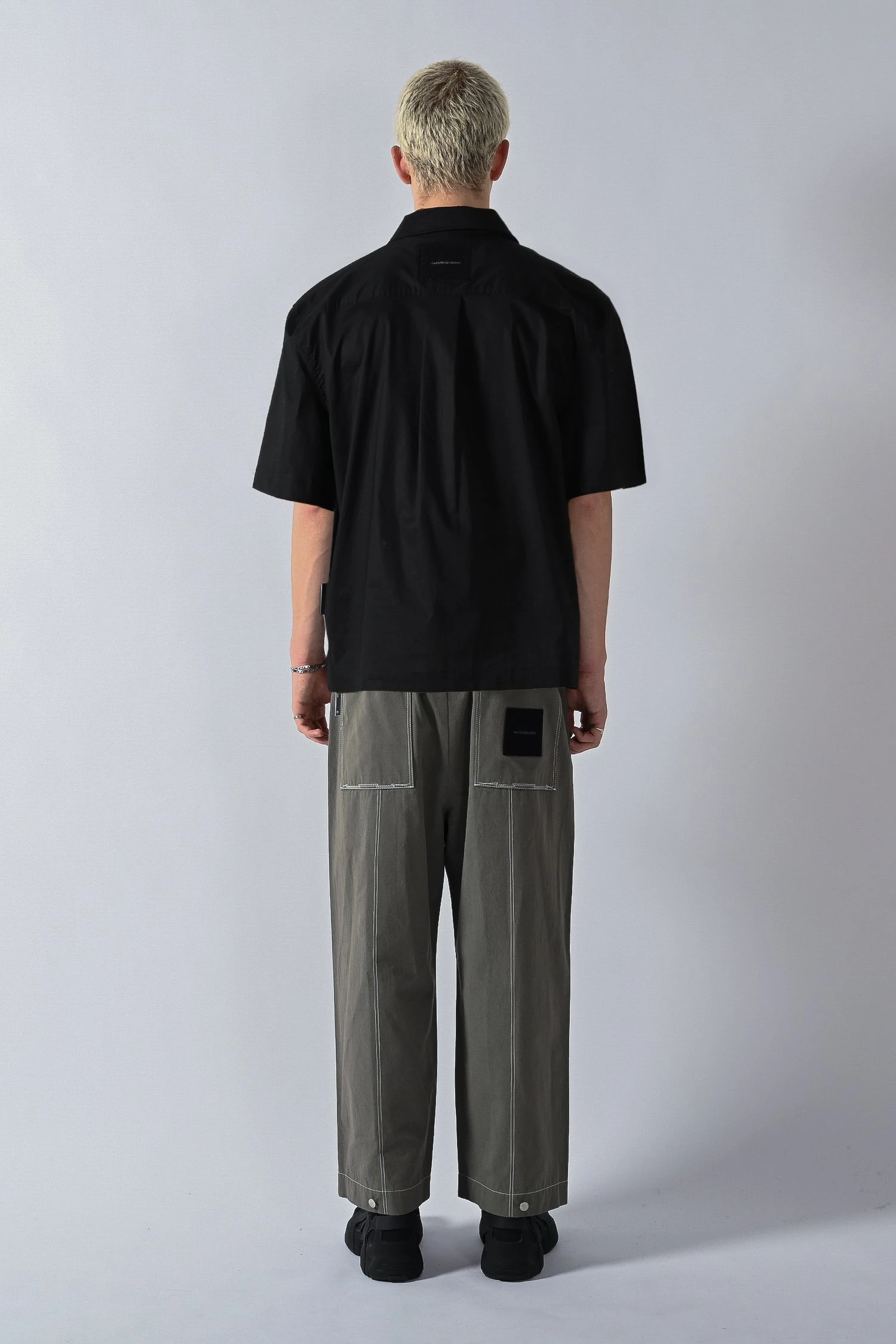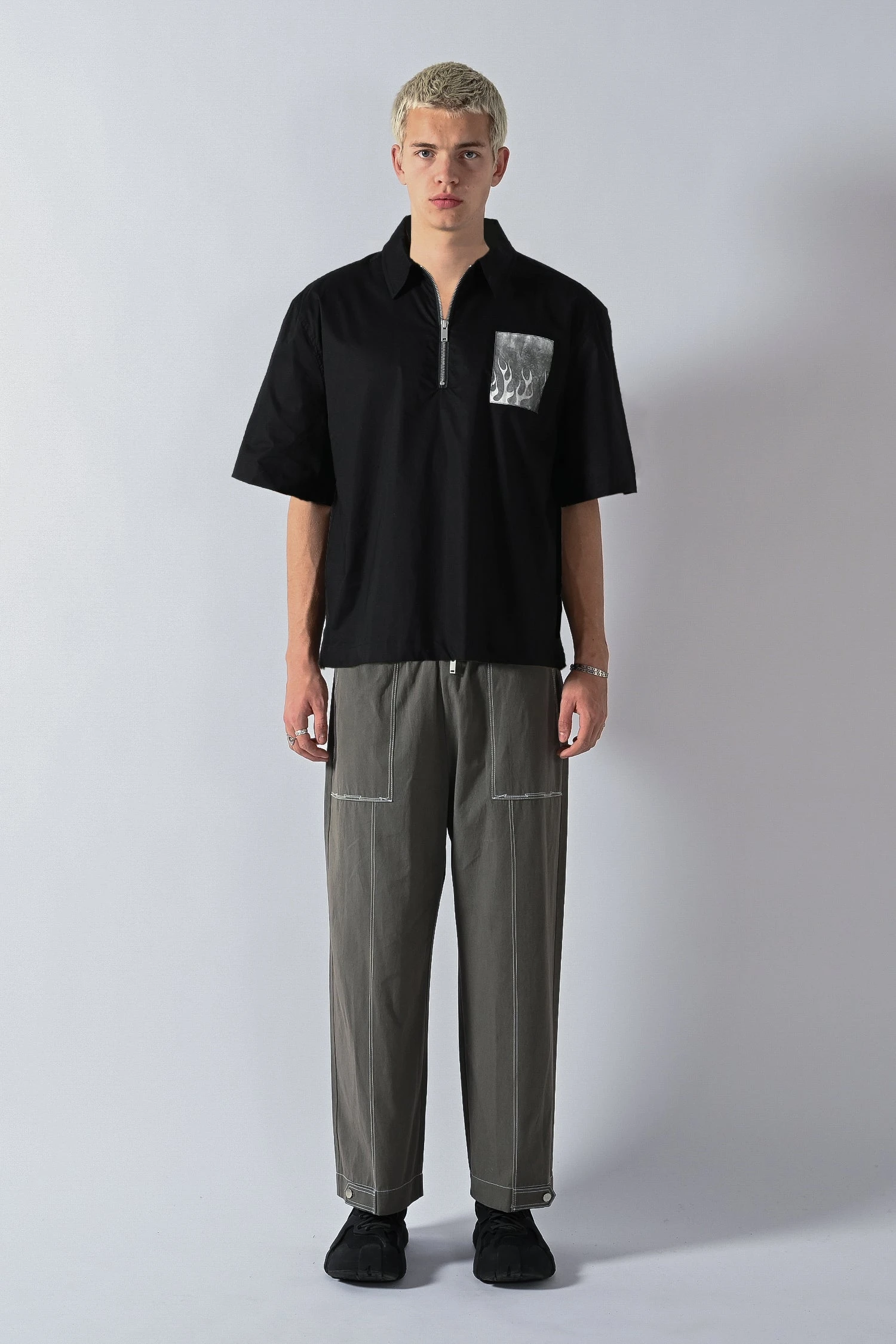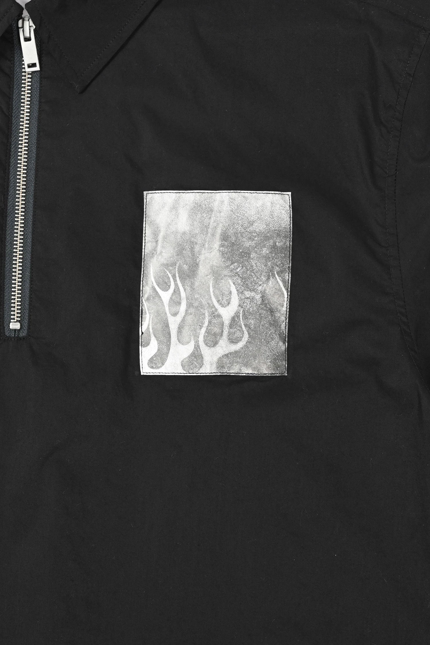 Relaxed boxy fit short sleeve shirt made from high density cotton poplin fabric with a quarter zip neck closure, dropped shoulder cut and tyvec flame print graphic on the chest.