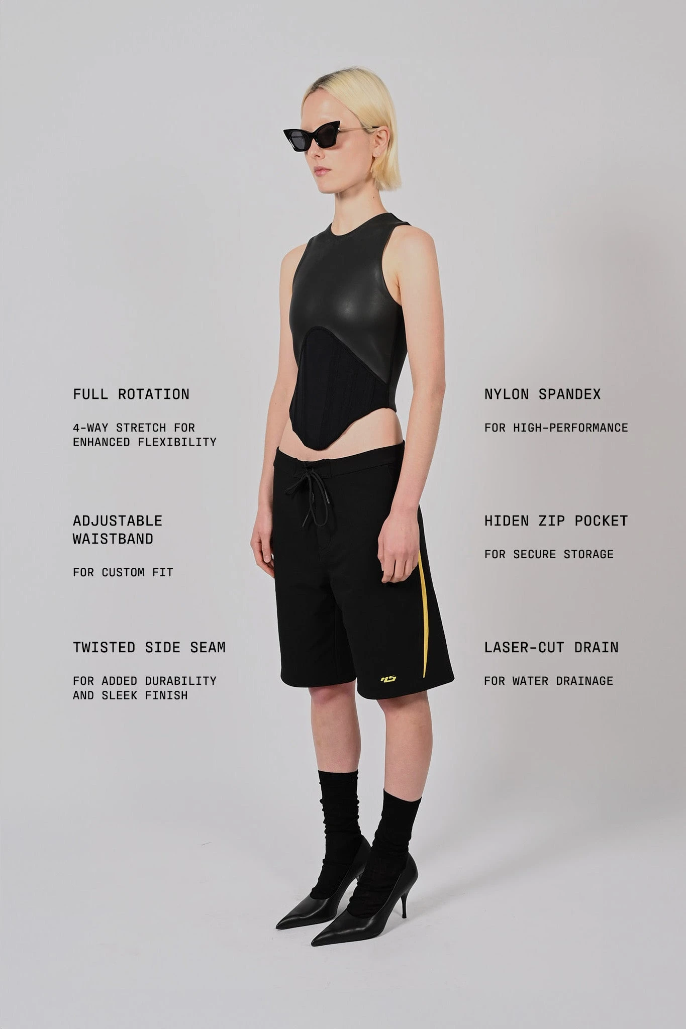 A high-performance boardshort designed for ultimate flexibility in the water. Featuring an iconic ’90s surfer 3/4 knee length (20-inch outseam), crafted from 4-way stretch performance nylon-spandex for ocean wear. It’s designed with an adjustable waistband, internal taped seams, a back yoke with a hidden back zip pocket, laser-cut drain holes, twisted side seams, and an embroidered logo.