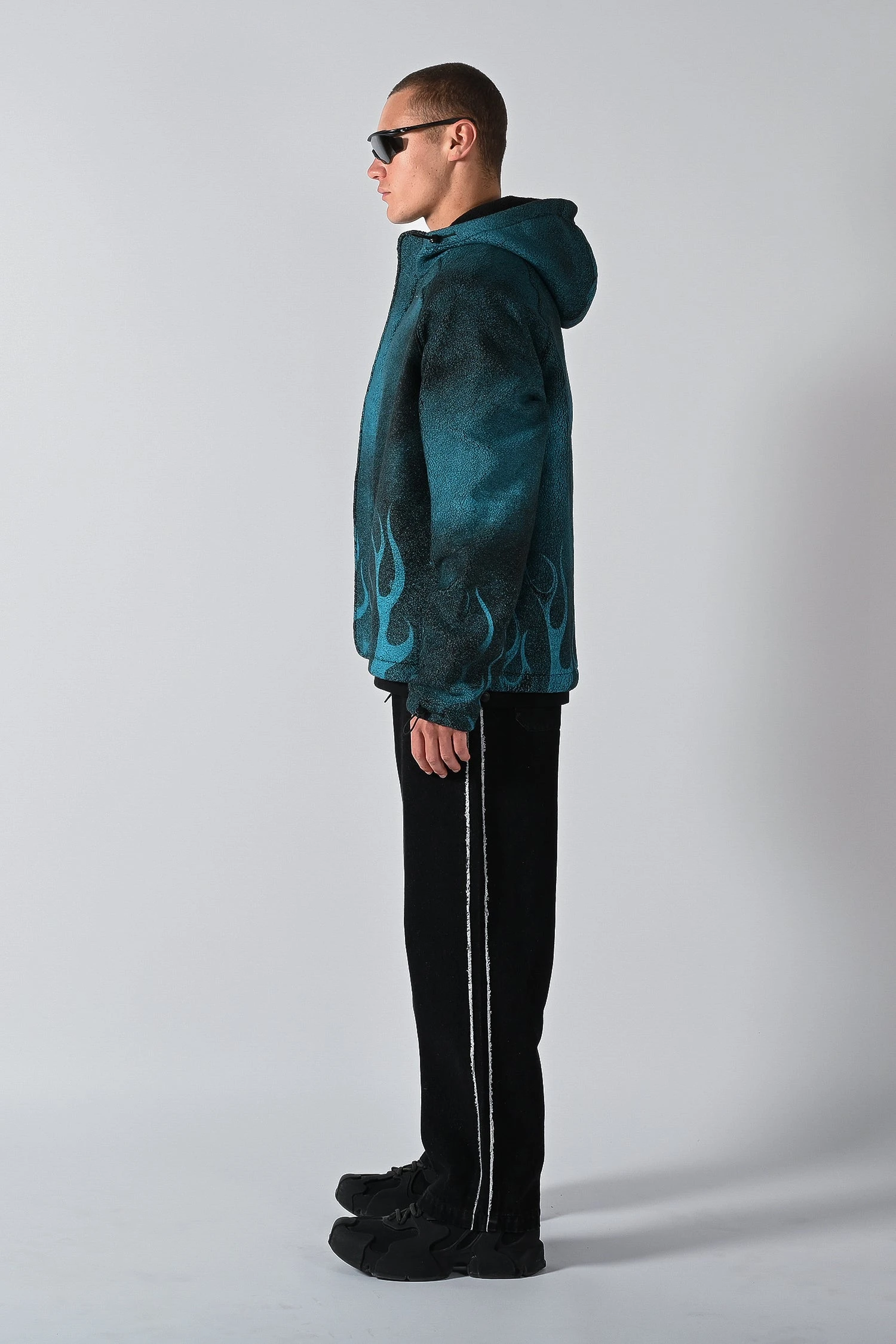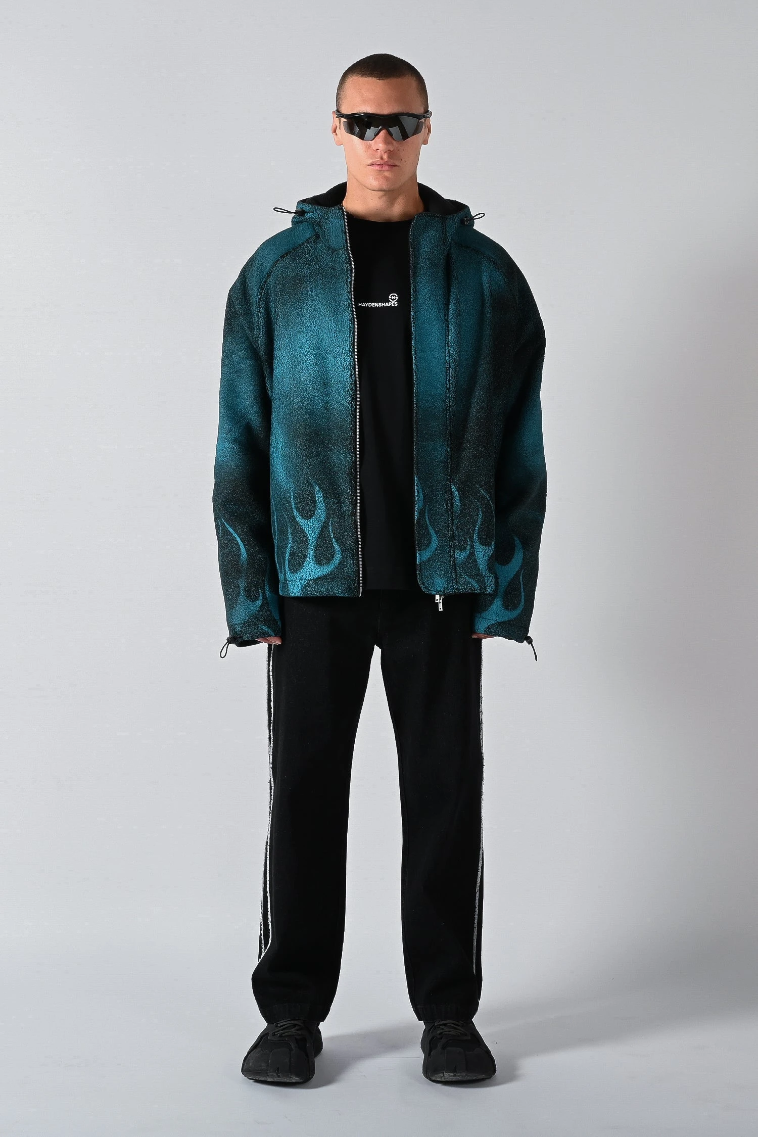 Made from recycled fleece fabric with a bold flame graphic print. The Traction Hooded Fleece Jacket features front mid zip pockets, an oversized hood, front zip entry and size adjustable waistband and sleeves.