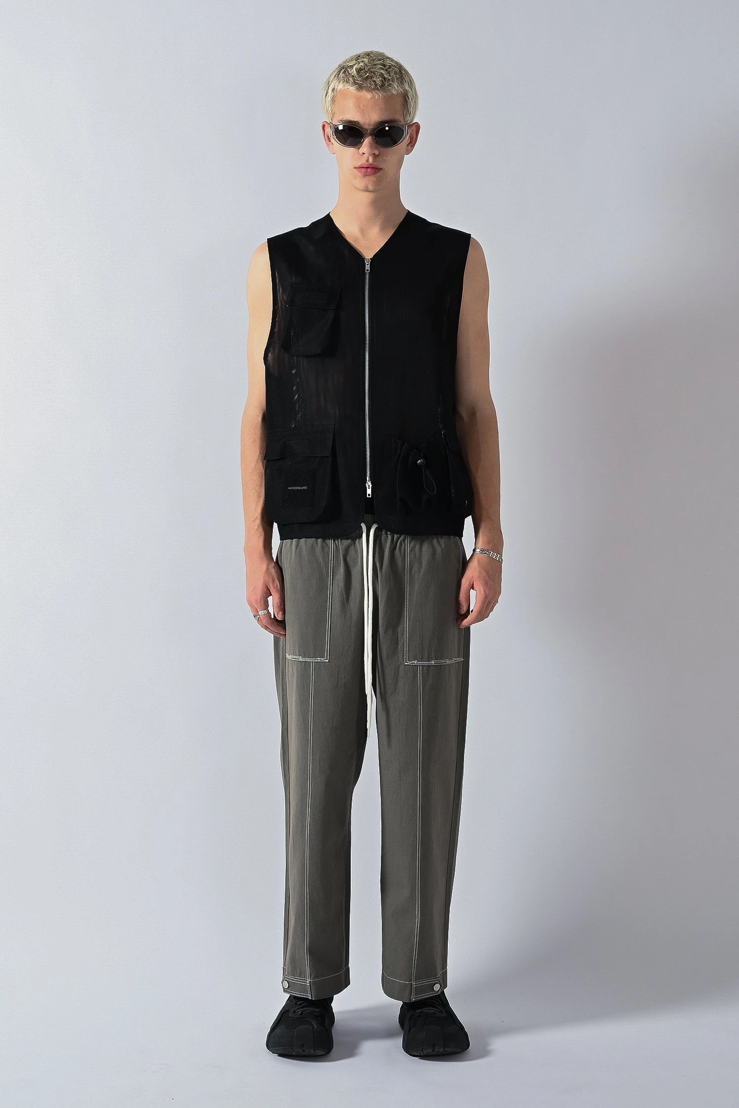 Y-neck design mesh fabric vest with front zip entry and front utility pockets, featuring an embroidered loop fabric logo.